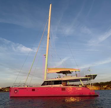 We are Yvette and Darcy, a professional couple offering unforgettable private charters aboard our beautiful Sunreef 62 catamaran, Supernova.